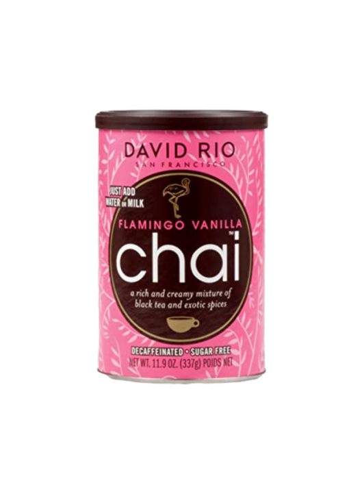 El té chai Flamingo Vanilla, es uno de los favoritos del mercado nacional con una cremosa mezcla de té negro descafeinado y endulzado con sucralosa, contiene especies exóticas tales como canela, cardamomo y vainilla.